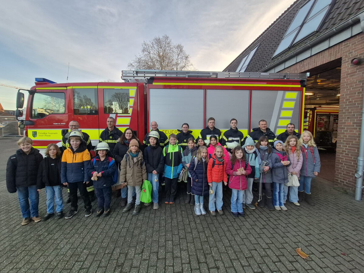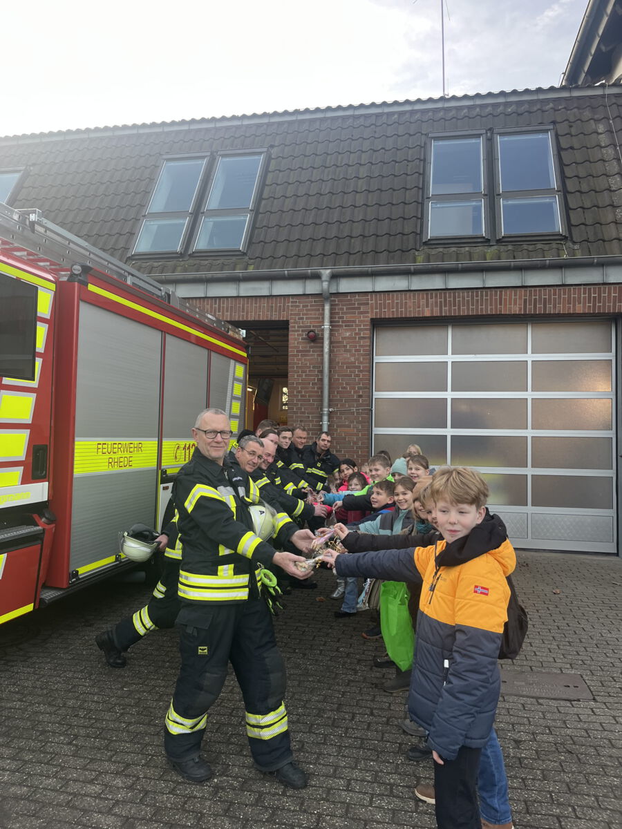 Auch praktische Hilfe stand auf dem Programm: Die Klasse 3a sammelte Müll im Bürgerpark und füllte dabei einen großen Anhänger. Die Klasse 3b bastelte bunte Glücksteine, die anderen Menschen ein Lächeln ins Gesicht zaubern sollen. Die Klasse 4d brachte selbstgebackene Plätzchen zur Freiwilligen Feuerwehr Rhede und verteilte anschließend weitere in der Innenstadt.