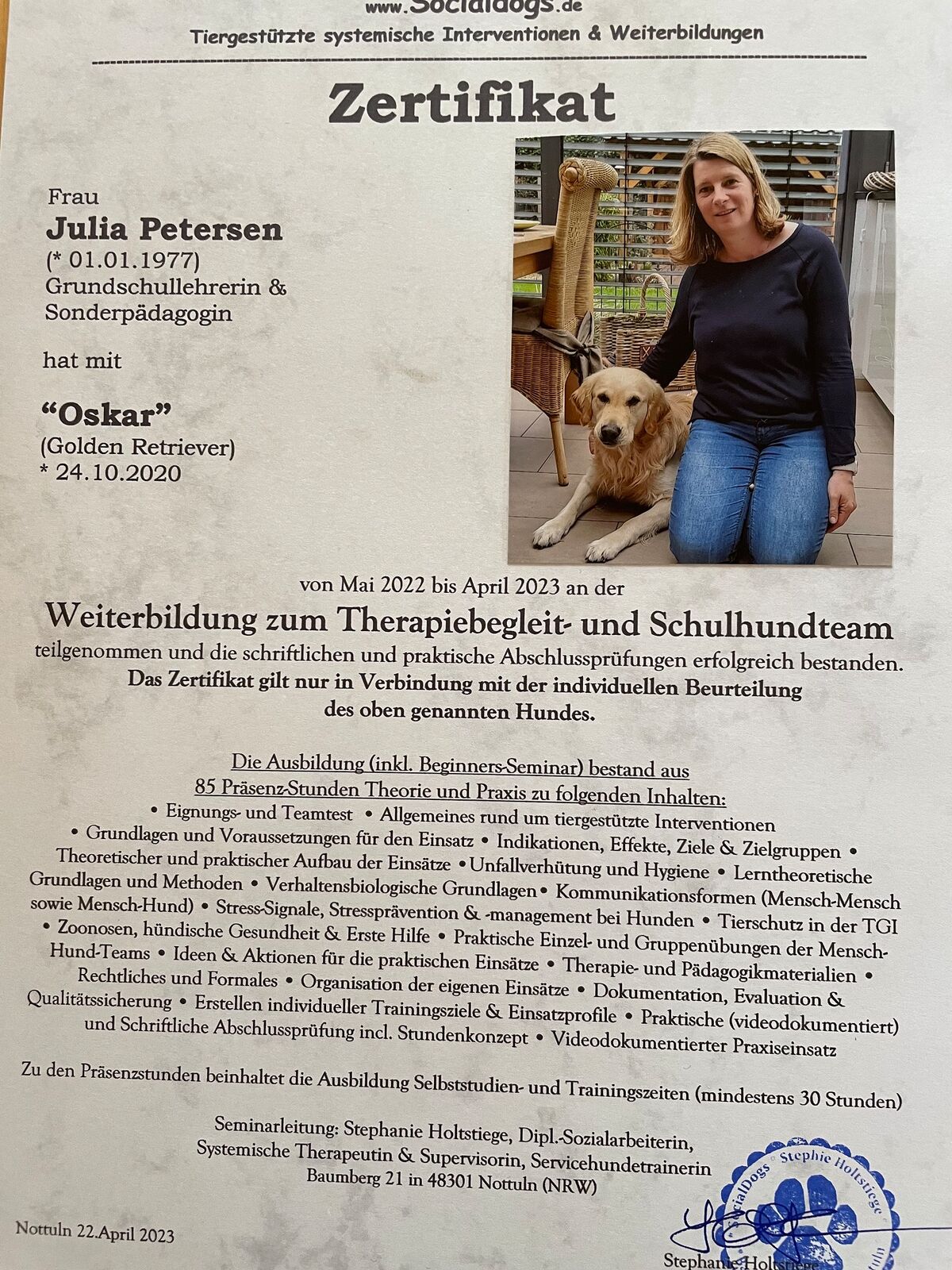Am 26.04.2023 haben Oskar und Frau Petersen die Abschlussprüfungen zum Therapiebegleit – und Schulhundteam erfolgreich bestanden. Die Prüfung bestand aus zwei Teilen, eine praktische Einsatzprüfung für Oskar und eine umfangreiche Theorieprüfung für Frau Petersen.