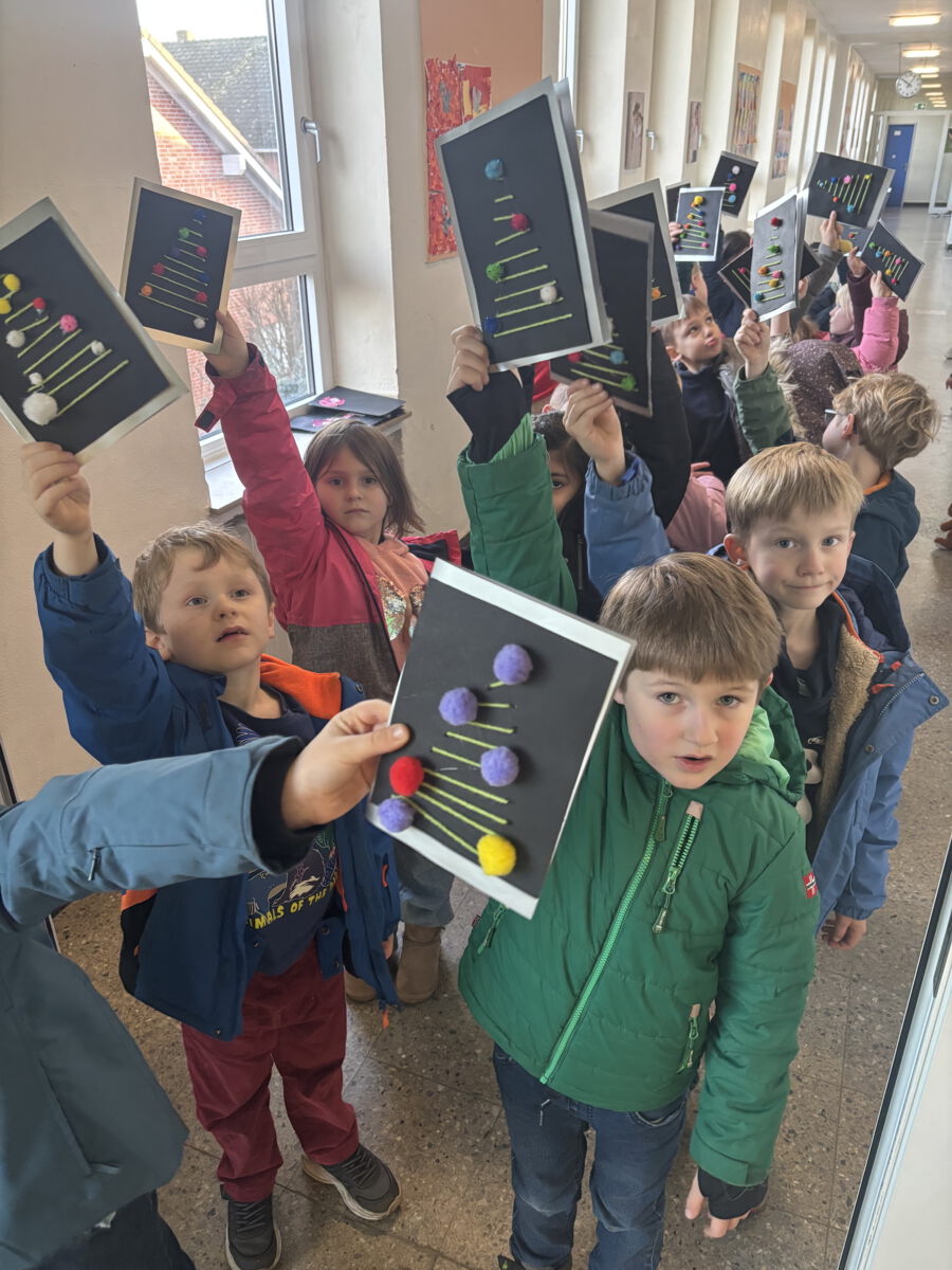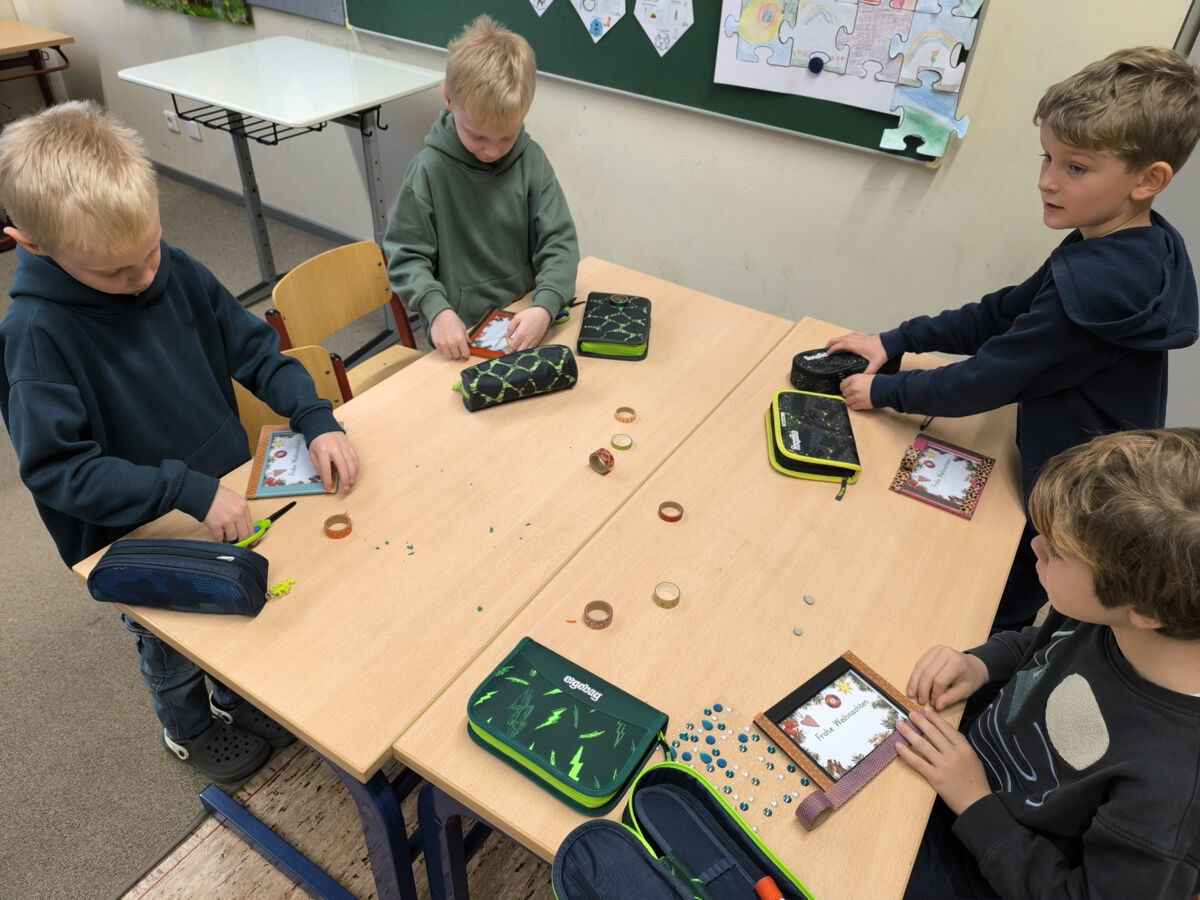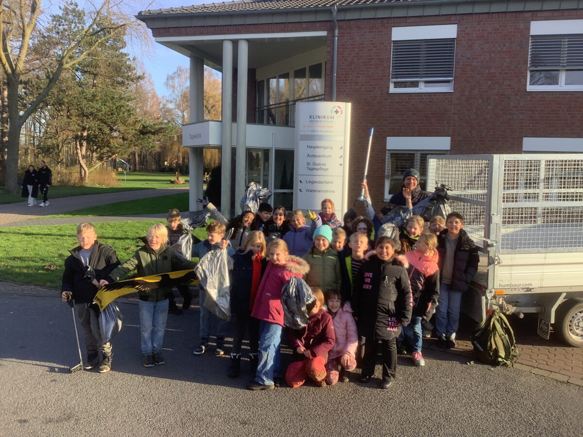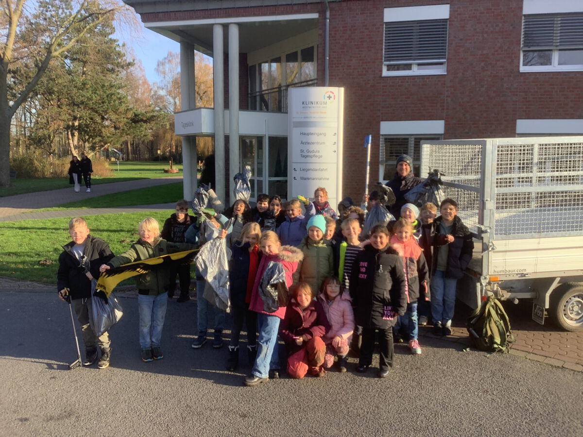 Auch praktische Hilfe stand auf dem Programm: Die Klasse 3a sammelte Müll im Bürgerpark und füllte dabei einen großen Anhänger. Die Klasse 3b bastelte bunte Glücksteine, die anderen Menschen ein Lächeln ins Gesicht zaubern sollen. Die Klasse 4d brachte selbstgebackene Plätzchen zur Freiwilligen Feuerwehr Rhede und verteilte anschließend weitere in der Innenstadt.