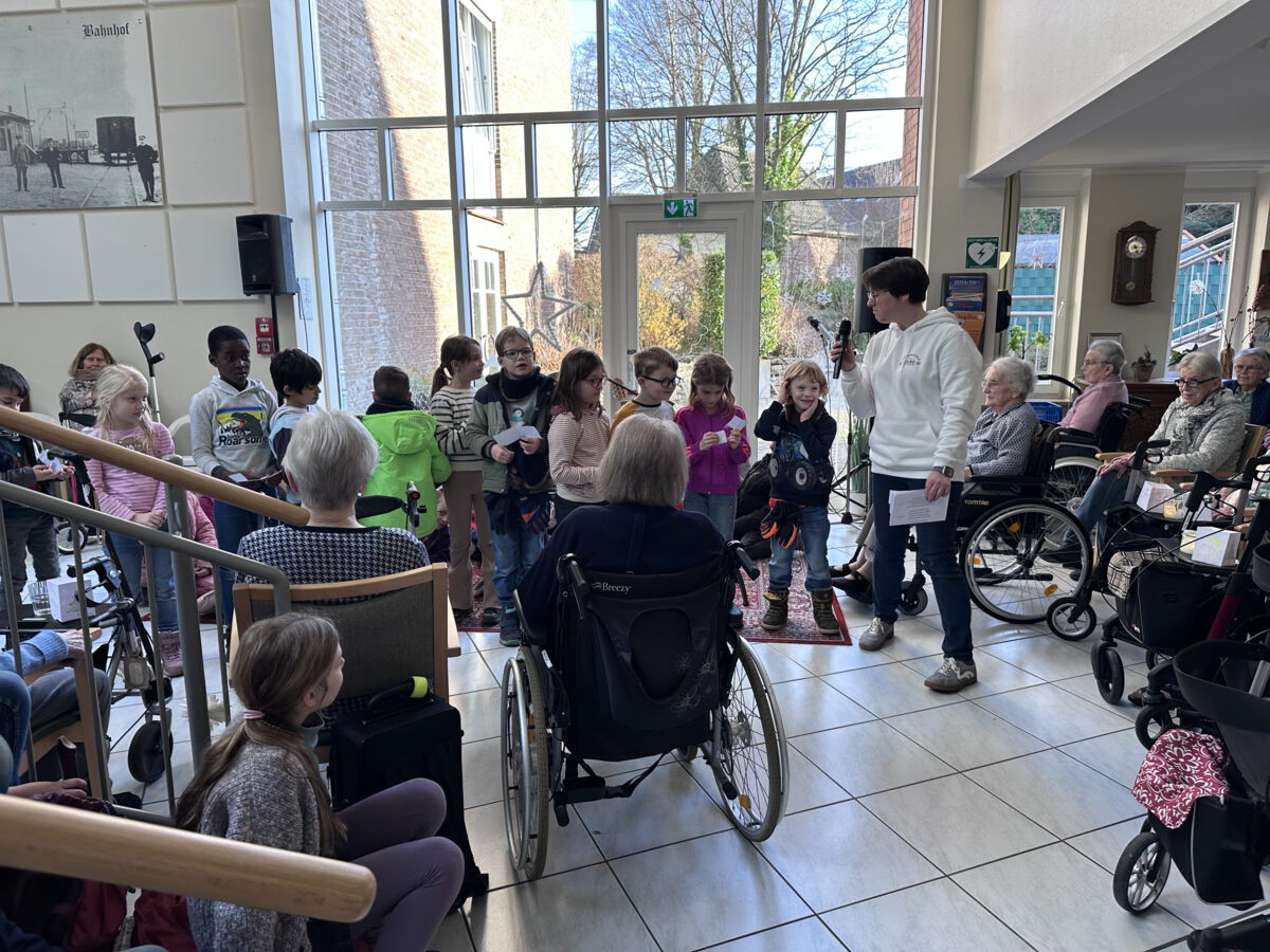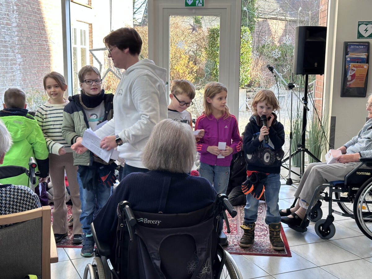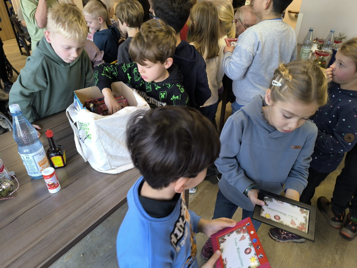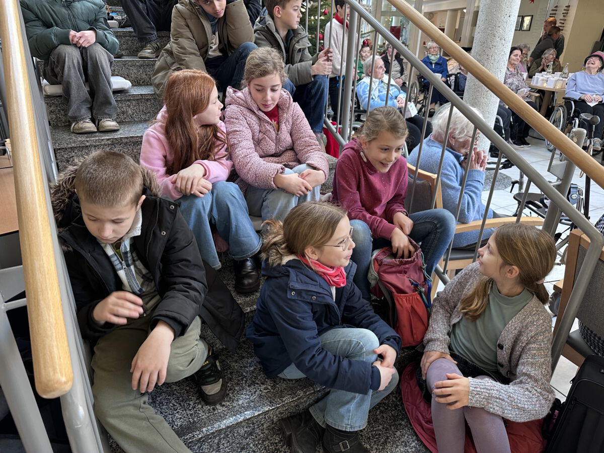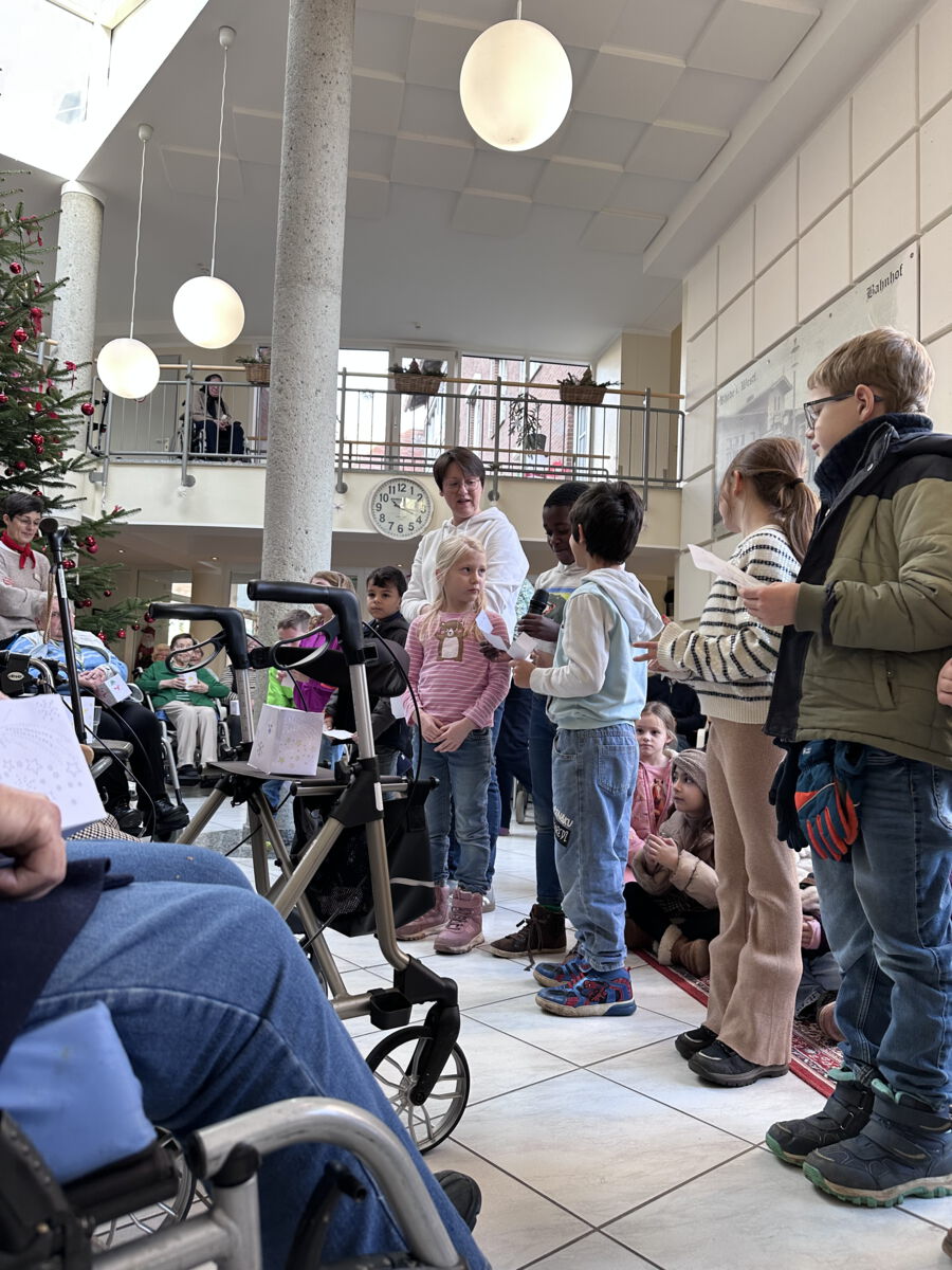 Besonders bewegend waren die Besuche in den Altenheimen. Die Klasse 1a gestaltete alte Bilderrahmen im Sinne des Upcyclings neu und brachte diese als Geschenke ins Azurit-Altenheim. Dort sangen die Kinder Weihnachtslieder auf allen drei Etagen. Die Freude der Bewohnerinnen und Bewohner war groß – ein weiterer Besuch der Schule ist geplant. Auch die Klassen 2a und 4a besuchten das Altenheim St. Hildegard, wo sie mit Instrumentalmusik, gemeinsamem Singen und selbstgebastelten Lichtern für ein unvergessliches Erlebnis sorgten.