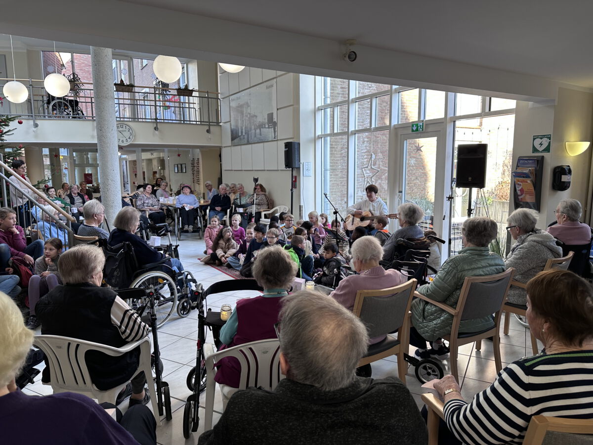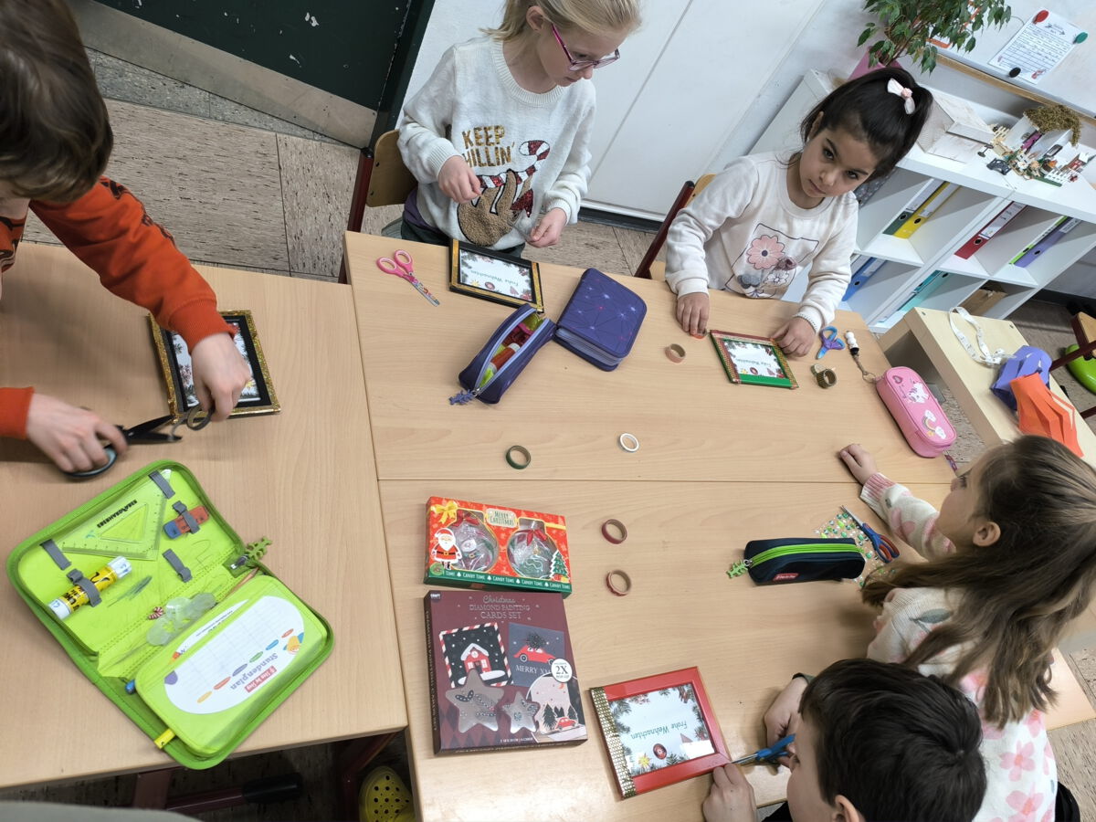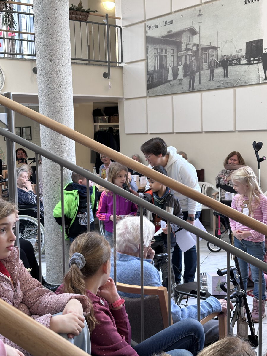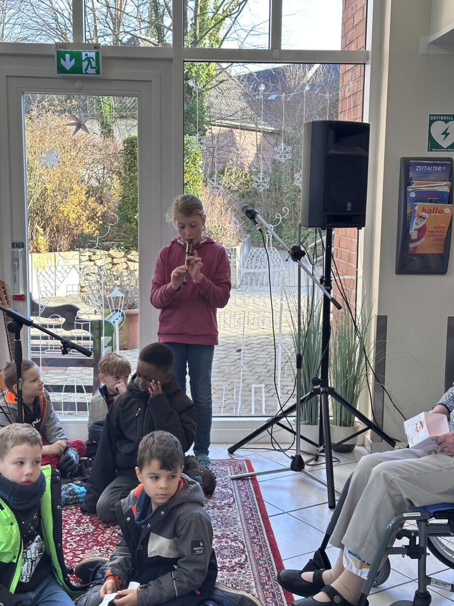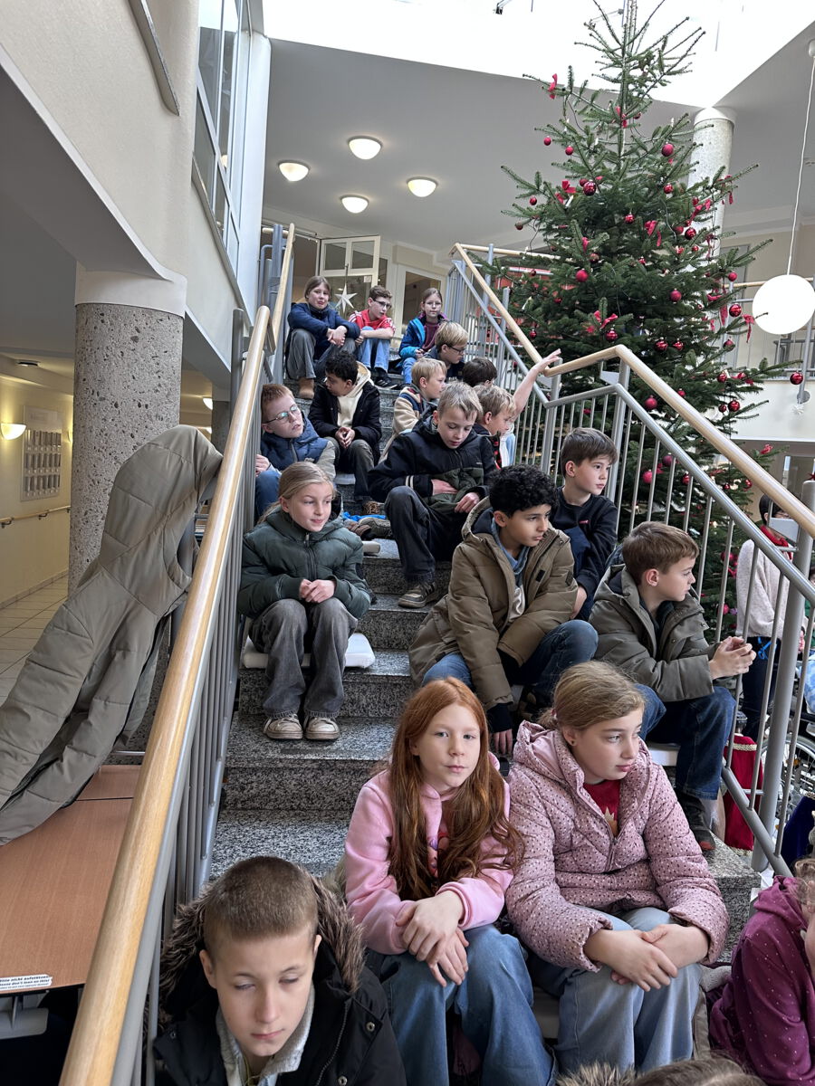 Besonders bewegend waren die Besuche in den Altenheimen. Die Klasse 1a gestaltete alte Bilderrahmen im Sinne des Upcyclings neu und brachte diese als Geschenke ins Azurit-Altenheim. Dort sangen die Kinder Weihnachtslieder auf allen drei Etagen. Die Freude der Bewohnerinnen und Bewohner war groß – ein weiterer Besuch der Schule ist geplant. Auch die Klassen 2a und 4a besuchten das Altenheim St. Hildegard, wo sie mit Instrumentalmusik, gemeinsamem Singen und selbstgebastelten Lichtern für ein unvergessliches Erlebnis sorgten.