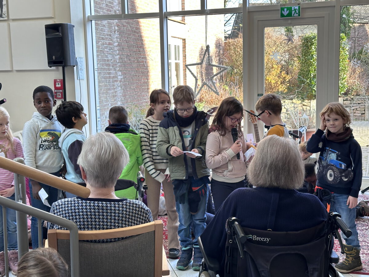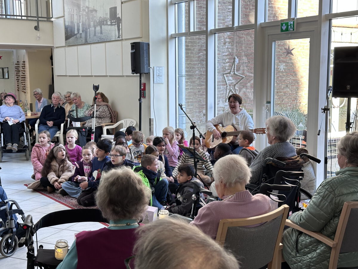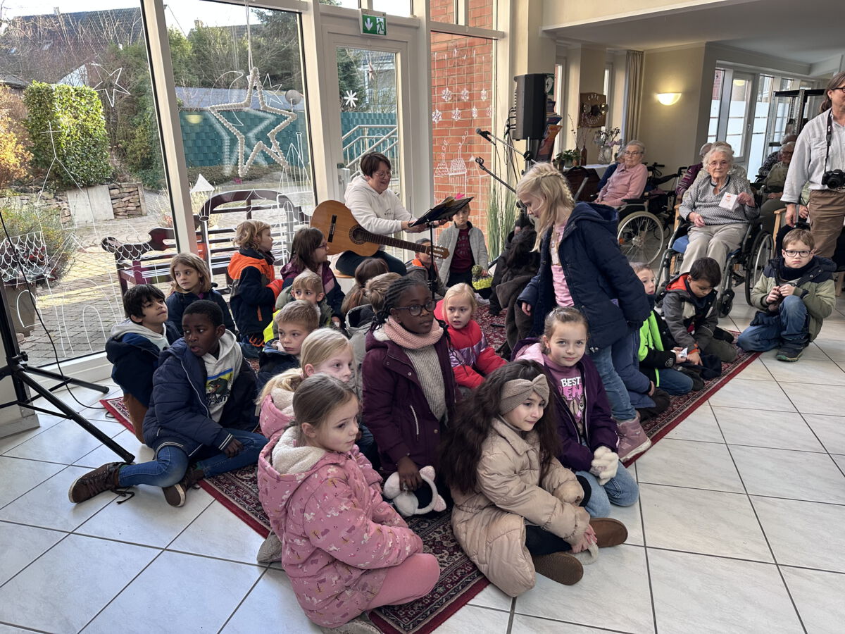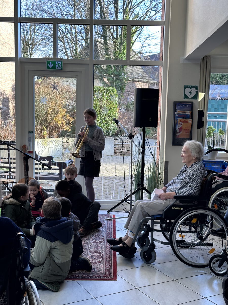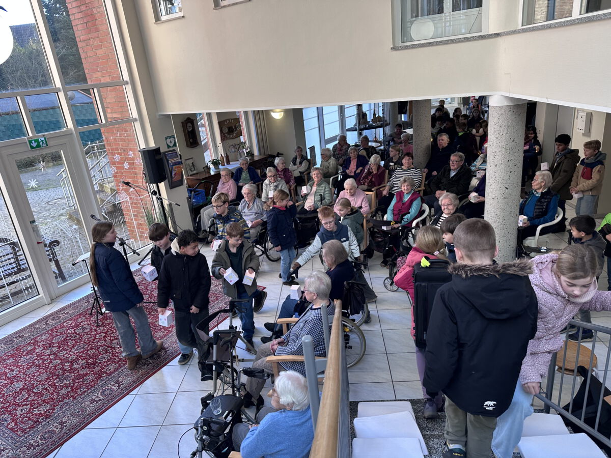 Besonders bewegend waren die Besuche in den Altenheimen. Die Klasse 1a gestaltete alte Bilderrahmen im Sinne des Upcyclings neu und brachte diese als Geschenke ins Azurit-Altenheim. Dort sangen die Kinder Weihnachtslieder auf allen drei Etagen. Die Freude der Bewohnerinnen und Bewohner war groß – ein weiterer Besuch der Schule ist geplant. Auch die Klassen 2a und 4a besuchten das Altenheim St. Hildegard, wo sie mit Instrumentalmusik, gemeinsamem Singen und selbstgebastelten Lichtern für ein unvergessliches Erlebnis sorgten.