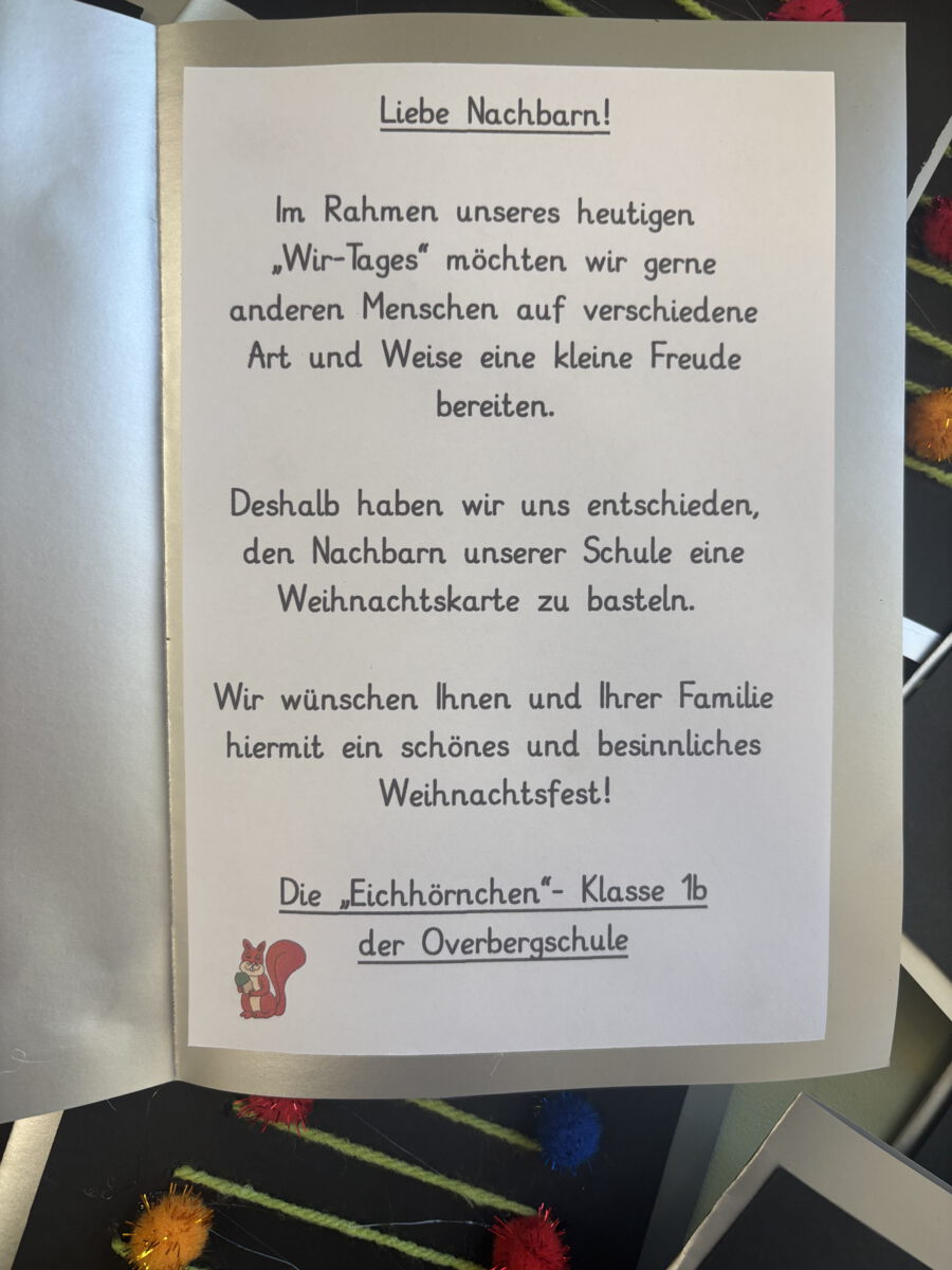 Mit viel Herz, Engagement und Kreativität haben die Schülerinnen und Schüler der Overberggrundschule am 16. Dezember erstmals einen besonderen Aktionstag gestaltet: den „Wir-Tag für andere Menschen“. Ziel dieses Tages war es, anderen eine Freude zu machen und den Gedanken der Gemeinschaft in der Vorweihnachtszeit aktiv zu leben. Alle Klassen beteiligten sich mit großer Begeisterung an vielfältigen Aktionen im gesamten Stadtgebiet.